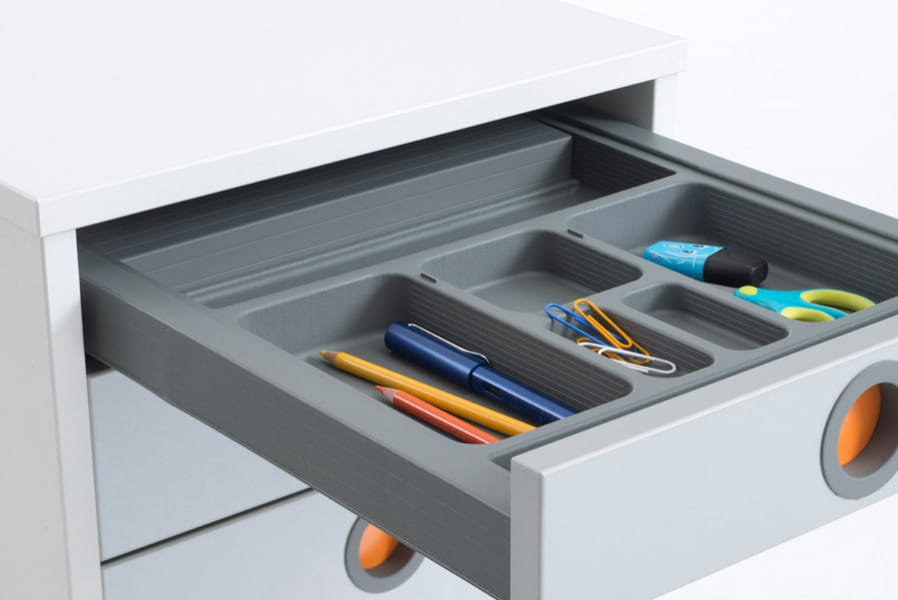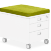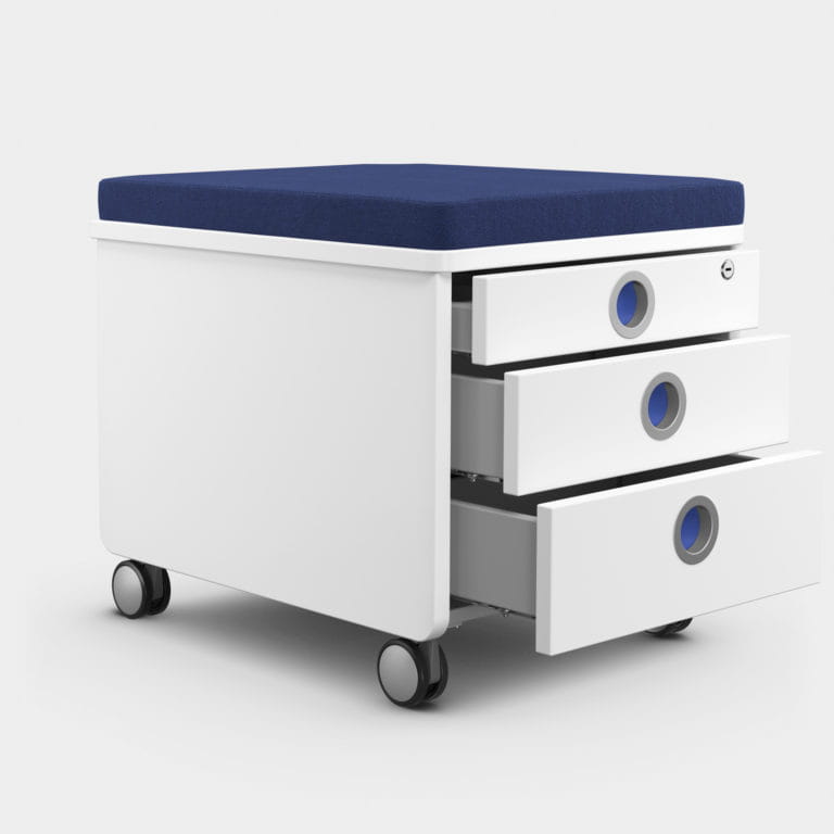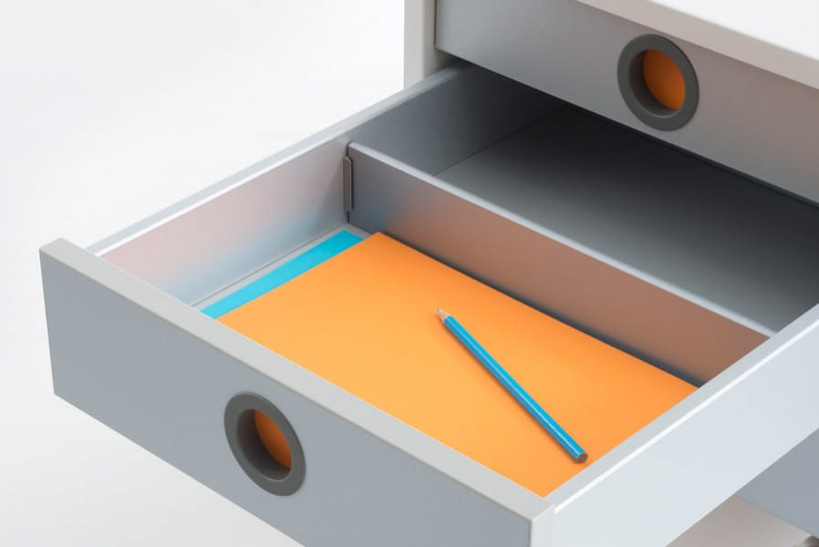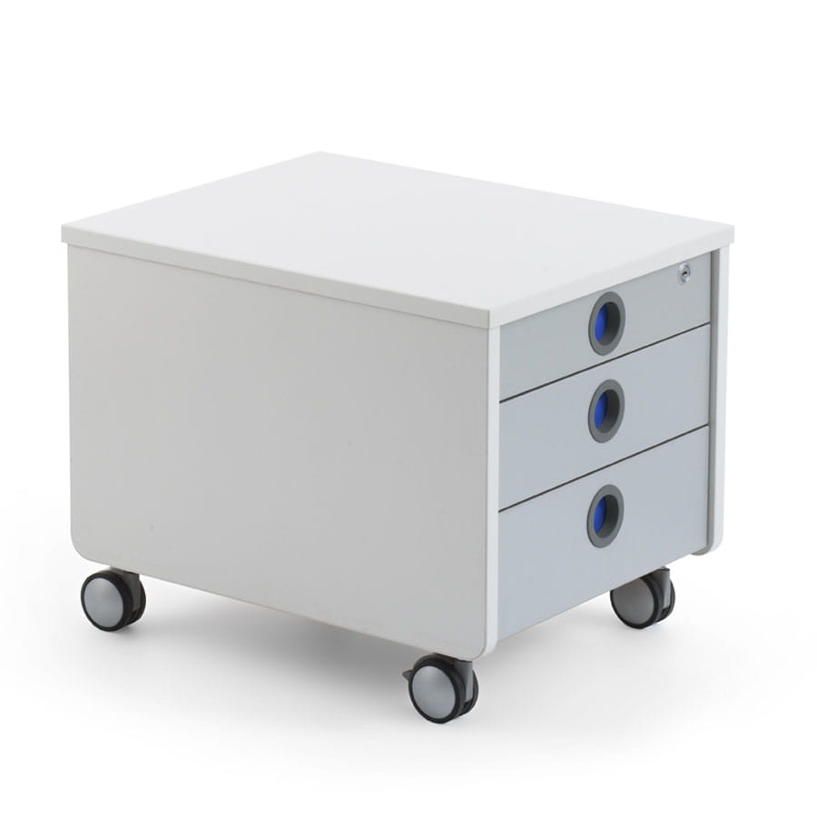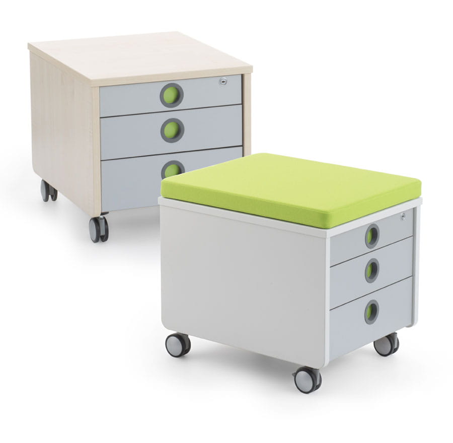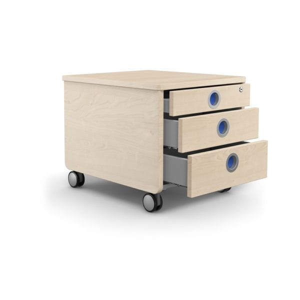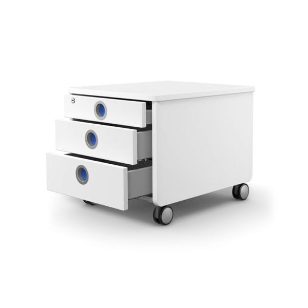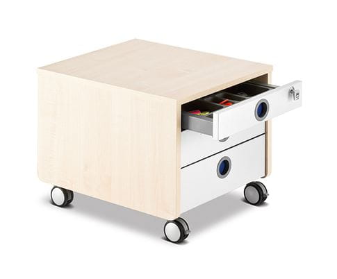 Kontenery do biurek dziecięcych MOLL to mobilne, ergonomiczne organizery na kółkach, idealnie dopasowane do regulowanych biurek Champion, Winner czy Joker, produkowane w Niemczech z wysokiej jakości materiałów. Modele jak CUBIC i CUBICMAX oferują 2-4 szuflady z miękkim domykiem, organizer OrgaSet, ukryte przegródki na drobiazgi oraz wymienne kolorowe uchwyty w 6-8 wariantach (łatwa zmiana przez dzieci), zapewniając porządek przy biurku bez montażu – gotowe do użycia. Wymiary kompaktowe (43x54x43-88 cm) mieszczą się pod biurkiem, kółka z blokadą gwarantują stabilność, a opcjonalne poduszki PAD czynią je mobilnymi stołkami dla dzieci i gości. Neutralna kolorystyka pasuje do pokojów dziecięcych i biurowych, promując samodzielność, kreatywność oraz zdrową postawę dzięki kompatybilności z meblami MOLL rosnącymi z dzieckiem. Idealne do przechowywania zabawek, przyborów szkolnych i notatników, transformując chaos w uporządkowane miejsce nauki.