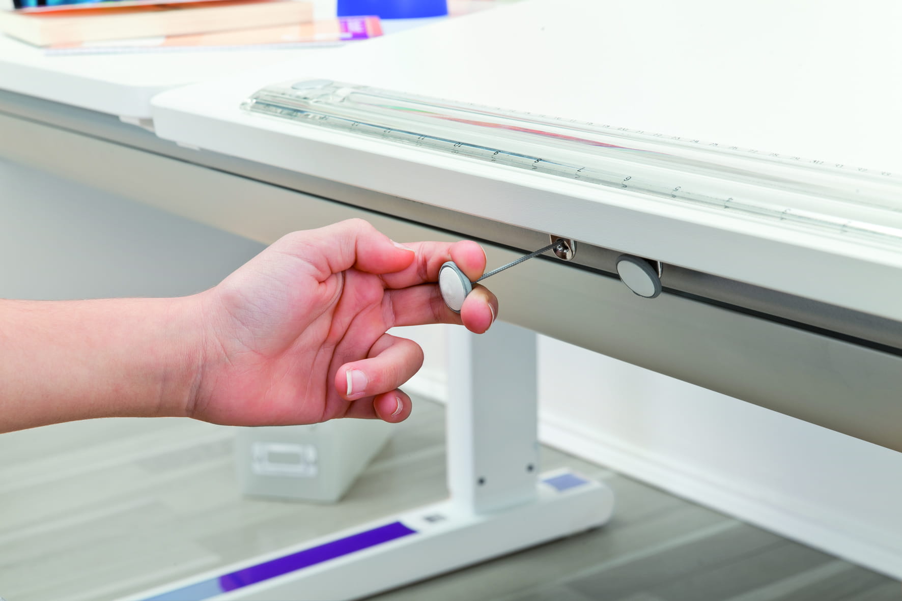 Dodatkowo zainstalowany nowoczesny system regulacji pochyłości blatu. Blat w całości uchylny.