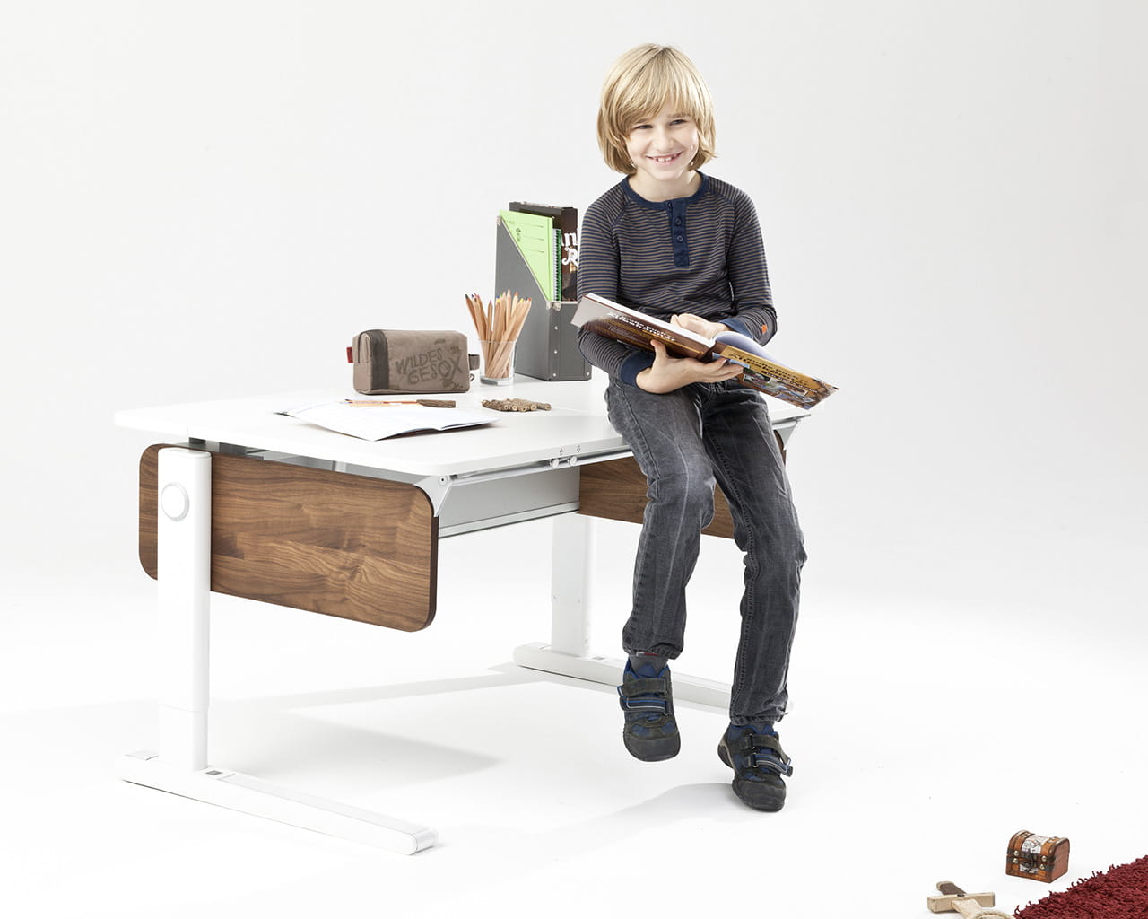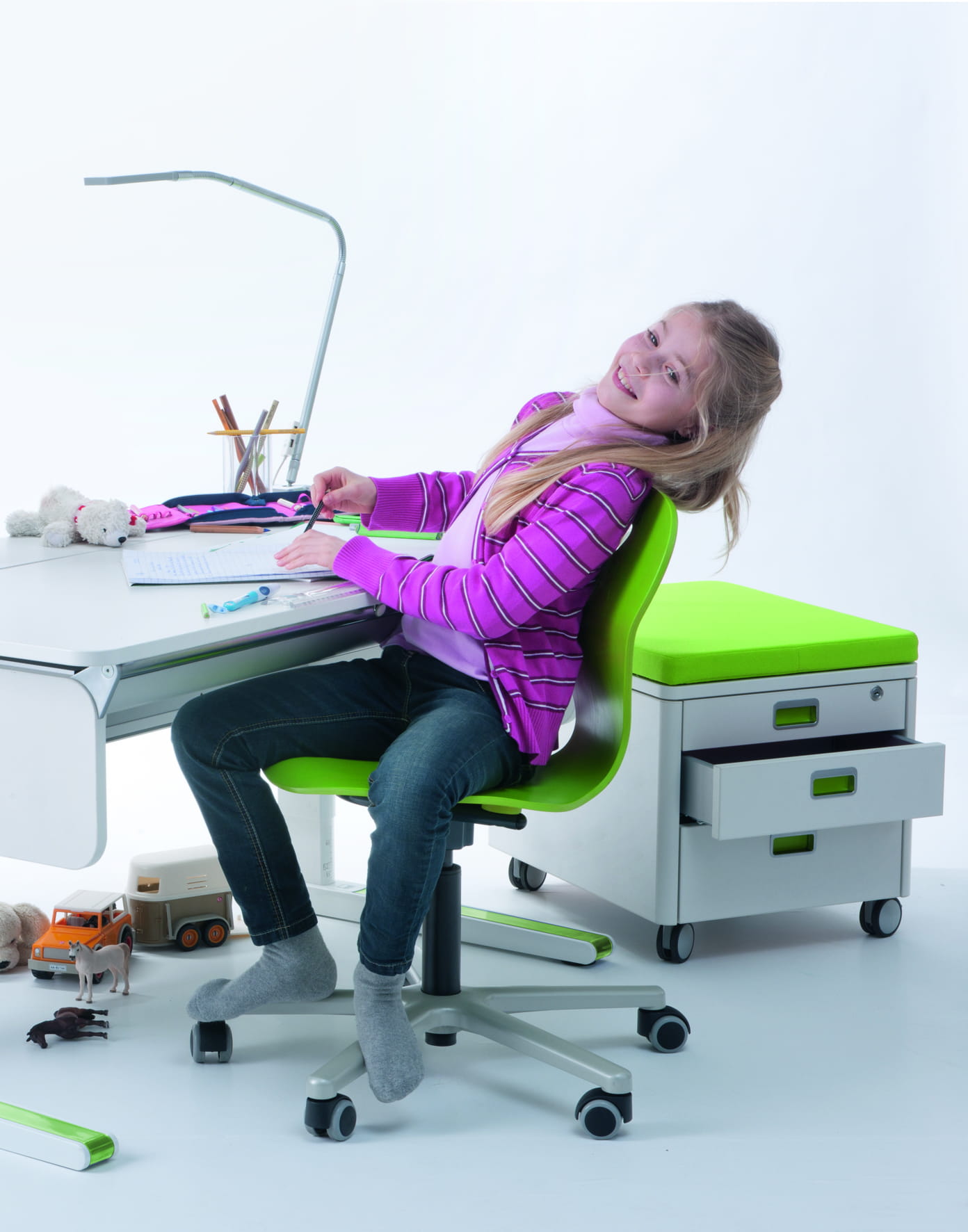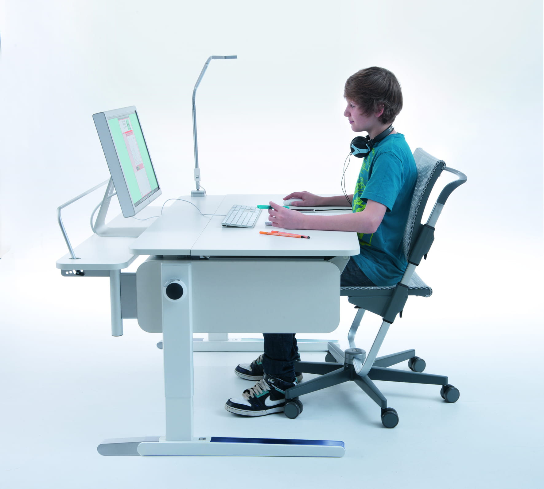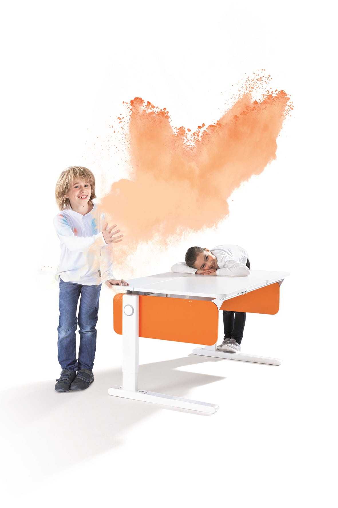 Biurko Champion right up rosnące wraz z dzieckiem łączy nowoczesny design połączony z wieloma przydatnymi funkcjami. Kolorystyka cała w białym kolorze plus dodatkowe elementy w 8 kolorach, które można wymieniać w każdej chwili. Wersja right up jest wersją biurka dla osoby leworęcznej – uchylna część blatu biurka po prawej stronie.